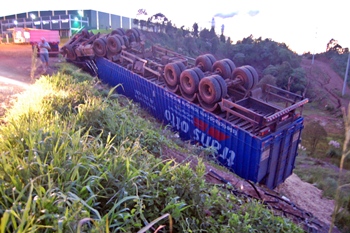 Uma carreta com placas de União da Vitória-PR tombou No início da manhã desta terça-feira, 21 de janeiro, no estacionamento de uma empresa na Rodovia Municipal Avelino Mandelli, em Caçador. O condutor havia acabado de chegar de viagem estacionava o veículo quando acabou caindo com a parte traseira em um barranco, ficando suspensa a beira de um precipício de mais trinta metros.
