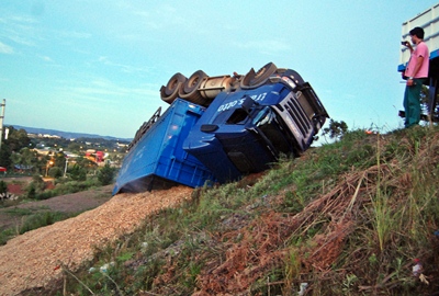 É meus caros amigos, desta vez foi irresponsabilidade do motorista,ele ignorou os avisos do vigilante da portaria e de um outro motorista para não encosta-se no barranco, agora sofra por tombar a carreta nova na transportadora trans otto !
