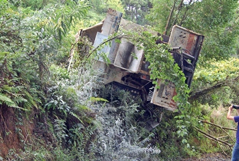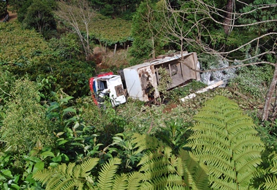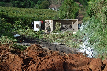 Um acidente de trânsito registrado na tarde desta sexta-feira, 24 de janeiro, na Estrada Geral da Linha Rio Bugre feriu duas pessoas. Um caminhão pertencente a uma empresa que atua na pavimentação da estrada da comunidade tombou e caiu em um barranco de quase 20 metros.