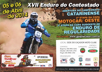No próximo final de semana, dias 5 e 6 de Abril o Caçador Moto Clube estará realizando a 17ª Edição do Enduro do Contestado. O município estará recebendo os melhores pilotos de Santa Catarina e também do Rio Grande do Sul e Paraná. Neste ano, a briga pelo título na principal categoria, a Categoria Master, promete ser ainda mais acirrada do que em 2013. O Bicampeão Brasileiro e atual campeão Catarinense Guilherme Cascaes de Tubarão/SC vai precisar acelerar forte para manter o título e ficar à frente do jovem piloto, Jonas Schulz da cidade de São Ludgero/SC; ainda estarão na briga pela vitória na categoria Master, do XVII Enduro do Contestado, pilotos de renome como Genoir Brunning, Felipe Knapp, Leandro Jahnel, Charleu Spricigo, Nei de Bona, Michel Cechet entre outros.