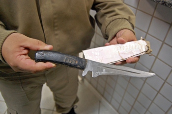 Efetuando rondas pelas imediações, os policiais encontraram o acusado já próximo a Rodovia Honorino Moro. Ele confessou que teria ameaçado a mulher, arrombado a porta e jogado a faca ainda próximo a casa.