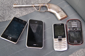 Um jovem de 22 anos foi detido pela Polícia Militar de Caçador na manhã desta segunda-feira, 14 de abril, depois de roubar três celulares e ameaçar dois adolescentes em frente a uma escola no centro do município. O elemento portava um simulacro artesanal de arma de fogo e um VW Golf para se locomover.