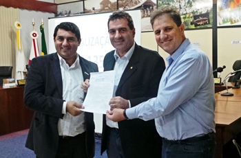 O deputado Valdir Cobalchini, acompanhado do secretário de Estado da Infraestrutura, João Carlos Eker, entregou oficialmente, na noite de quinta-feira (8), ao prefeito Alcir Bodanese, o edital de licitação do novo contorno de Rio das Antas e nova ponte sobre o rio do Peixe. A obra, que desvia o trânsito do centro da cidade, vai custar R$ 8,2 milhões, incluída no Pacto por Santa Catariana.