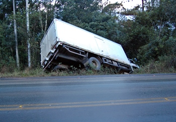 Um caminhão carregado de produtos alimentícios saiu de pista na tarde desta quinta-feira, 6 de junho, na Rodovia SC-135, entre Caçador e Rio das Antas. Chovia na hora do acidente e de acordo com o motorista uma mancha de óleo na pista pode ter sido a causa do acidente.