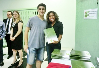 Desenvolvedores: Angelo Borsoi Ross, Luiz Gustavo Eburneo, Marcos Vinícius Lenz Balatka e Victor Barpp Gomes (na foto com a servidora Rose Atanásio).