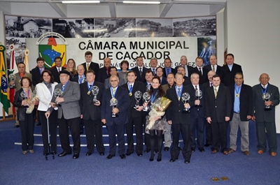 O empenho de 13 cidadãos pelo progresso de Caçador foi reconhecido pela Câmara Municipal de Caçador nessa quarta-feira (11). Durante sessão solene, realizada no Plenário Osvaldo José Gomez, eles receberam a Medalha do Mérito ‘Destaque Caçadorense’. A honraria instituída através da Lei nº 2.912, de 20 de junho de 2012 é destinada a homenagear aqueles que contribuíram para o engrandecimento de Caçador, através de sua atuação dentro ou fora do Município.