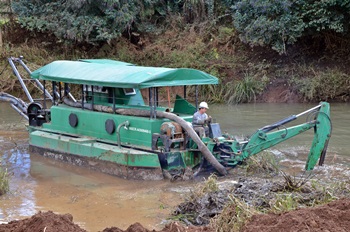 A Secretaria Municipal de Infraestrutura deu todo o suporte desde a manhã desta sexta-feira para que a draga fosse colocada dentro do rio. Posteriormente a equipe voltará a atuar na contenção do material retirado, evitando que retorne para o eleito do rio, assim como transportar material já seco, como lodo e mato, se houver necessidade.