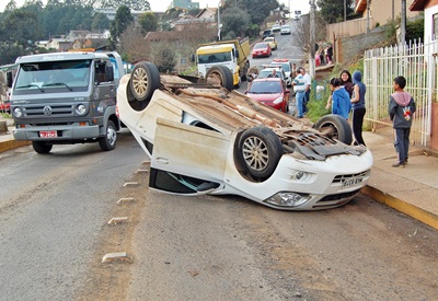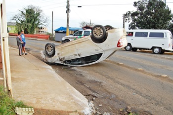 Um capotamento foi registrado na manhã desta quarta-feira, 23 de julho, na bifurcação das Rua Santiago Rodrigues e Curitiba, no Bairro Bello em Caçador. O acidente aconteceu depois que um veículo, passou em alta velocidade por uma lombada recém construída pelo departamento de trânsito do município.