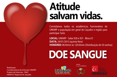 Dia 29 de janeiro, quinta-feira, a UNIARP de Caçador sedia a primeira campanha de doação de sangue do ano. A distribuição das senhas será realizada das 8h30min às 12h30min nas salas 920 e 921 do bloco A.