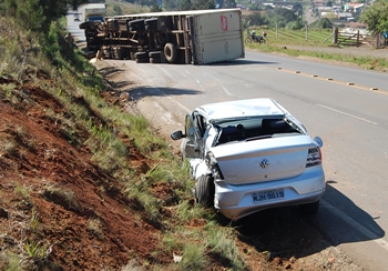 O trecho na Rodovia Municipal Honorino Moro onde já aconteceram vários acidente, foi novamente palco de grave colisão. Desta vez, após colidir contra um carro, um caminhão com placas de Brusque perdeu o controle e acabou tombando sobre a pista.