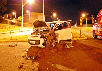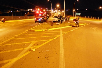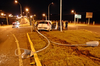 Quatro pessoas ficaram feridas na madrugada desta segunda-feira, 23 de março, depois que um veículo subiu num dos canteiros do trevo do SESI e derrubou um poste de iluminação pública. O veículo, um Fiat Pálio com placas de Videira ficou parcialmente destruído e as vítimas foram conduzidas ao Hospital Maicé.