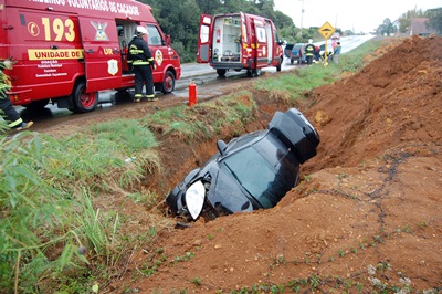 De acordo com informações, um Ford Ka com placas MHV-2392 de Caçador seguia pela rodovia quando nas proximidades do motel, o seu motorista esqueceu que havia uma lombada e para não bater atrás de outro veículo, tirou o carro para o acostamento. Segundo condutor, a pista estava molhada e ele até tentou frear, mas o veículo derrapou e acabou caindo na vala.