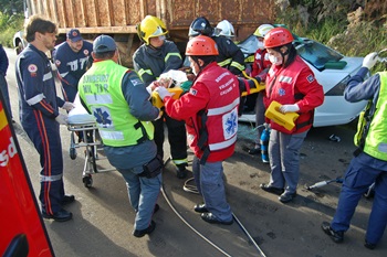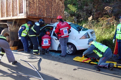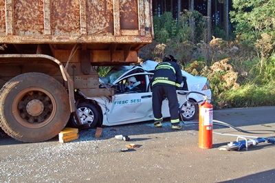 Uma funcionária do SESI ficou gravemente ferida num acidente de trânsito na manhã desta quarta-feira, 6 de maio, na Rodovia SC-350 próximo a divisa entre Caçador e Rio as Antas. Ela dirigia um Ford Fiesta de propriedade do SESI no momento em que colidiu na traseira de uma caçamba que seguia pela terceira faixa.
