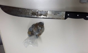 Cidadão desconfiou das atitudes do filho e acionou a Polícia Militar. Com o jovem foi encontrado uma touca bala clava, um facão e um saco de moedas