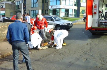 Um motociclista ficou ferido na manhã desta terça-feira, 19 de maio, depois de se envolver num acidente de trânsito na esquina das Ruas Herculano Coelho de Souza e Panamá, próximo ao Hospital Maicé. Ele teve ferimentos graves nas pernas e foi socorrido pelos bombeiros voluntários.