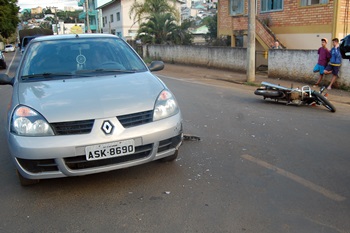 Ao perceber que iria bater na moto, o condutor tentou frear o veículo, porém a batida foi inevitável. Eles colidiram e os dois ocupantes da motocicleta caíram.