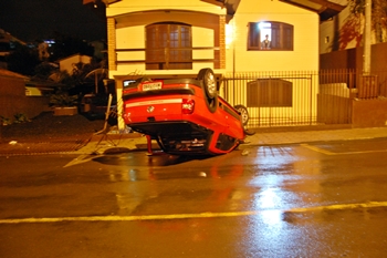 Um acidente de trânsito foi registrado na madrugada deste sábado, 27 de junho, na Rua Moacir Sampaio, no Bairro Berger, próximo ao antigo portão da empresa Viposa. Uma VW Saveiro Cross com placas de Caçador capotou e destruiu a cerca de uma residência.