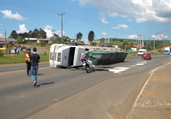 Uma carreta tombou no início da tarde desta quarta-feira, 05, na Rodovia Engenheiro Lourenço Faoro, proximidades da Alfa Transportes, saída para Lebon Régis. O acidente aconteceu por volta das 13h40min e deixou o transito lento por quase uma hora.