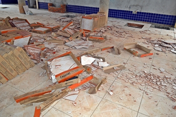 Centenas de telhas, azulejos, muretas, solários e portas dos forros foram destruídas ou danificadas pela ação de vândalos ao que tudo indica durante este domingo