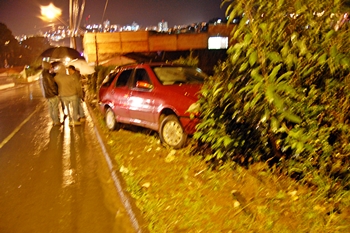 Depois de atingir o Gol, o Palio ficou desgovernado e atravessou a via, colidindo contra a cerca viva de um terreno particular.