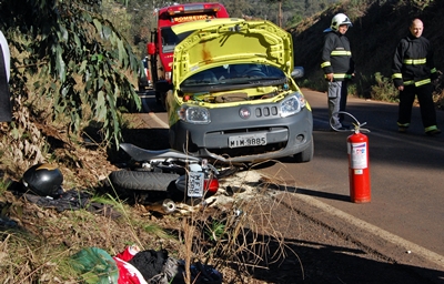 De acordo com informações, o condutor de uma Honda CB-300 com placa de Caçador seguia em direção á área urbana, quando se deparou com um buraco no asfalto. Com objetivo de tentar desviar, o motociclista invadiu a pista contrária, porém inesperadamente deu de encontro com um Fiat Uno, que trafegava no sentido contrário.