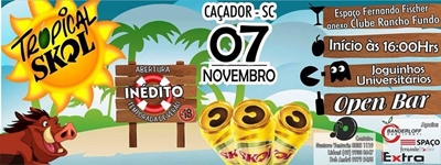 Acontece na próxima semana em Caçador uma festa totalmente nova e diferenciada. A TropicalSKOL - Abertura Temporada de Verão 2015. O evento será realizado no dia 07 de novembro no espaço Fernando Fischer em anexo ao Clube Rancho Fundo às 16h da tarde. Os idealizadores garantem que o objetivo é trazer á Caçador uma festa estilo república, que traga aos jovens uma opção inovadora de entretenimento. Na aquisição do ingresso cada pessoa ganhará um adesivo com uma combinação, participar fica a seu critério.