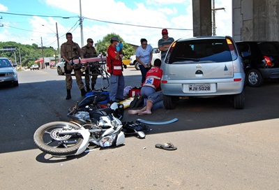 Um motociclista ficou ferido no início da tarde desta terça-feira, 8 de dezembro, depois de colidir sua moto contra um GM Corsa, em baixo do elevado Primo Tedesco, em Caçador. Ele teve suspeita de fratura exposta numa das pernas e foi socorrido pelo corpo de Bombeiros Voluntários.