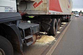 Com a força do impacto, o tanque de combustíveis da carreta chegou se arrancado e os pneus estouraram. Já o Golf rodou na pista e ficou com a frente totalmente destruída.