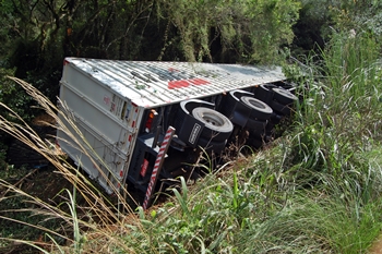 Uma carreta tombou na manhã desta quinta-feira, no KM 25 da SC-350 próximo a reserva Natural do Ibama. Segundo o motorista um buraco na pista teria o feito perder o controle da direção e sair da pista.