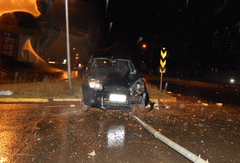 De acordo com informações, um Ford Fiesta com placas de Caçador seguia no sentido Posto Verenka/Sesi porém ao chegar no trevo não conseguiu contorná-lo e passou reto, subindo nos canteiros e batendo nos dois postes que iluminam o local.