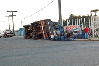 A Polícia Militar esteve no local e registrou um boletim de ocorrência. Após ter sido juntado toda a carga, um guincho destombou o caminhão.