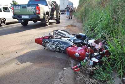 Um motociclista ficou gravemente ferido num acidente de trânsito no início da noite desta quinta-feira, 11 de fevereiro, na Rodovia Honorino Moro, próximo a entrada para o Bairro Vereda dos Trevos. Além da motocicleta Honda Twister ocupada pela vítima, a colisão envolveu uma VW Saveiro, cujo motorista não se feriu.