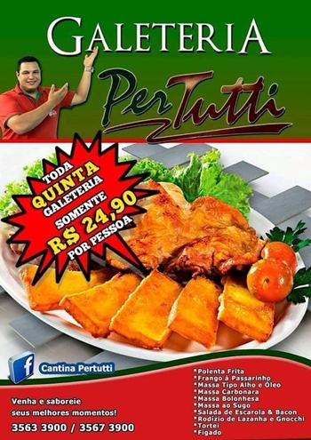 Agora, toda quinta-feira a Pizzaria e Galeteria Pertutti, traz uma promoção super bacana para seus clientes. Pagando apenas R$24,90 você saboreia os melhores pratos da galeteria.