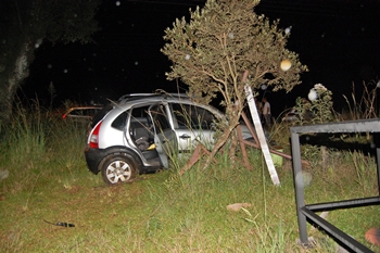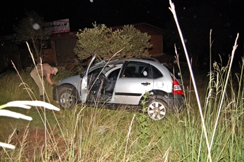 Depois de rodar na pista, o automóvel invadiu o terreno de uma empresa e parou ao lado de uma árvore.