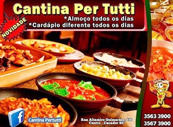 Servindo cardápio variado e diferenciado dos tradicionais pontos de Caçador, a Cantina Pertutti inova para mais uma vez trazer comodidade aos seus clientes. “Estaremos com as portas abertas de domingo a domingo, servindo a melhor comida da cidade”, destacou o proprietário, Dalvan Pereira.