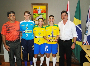O secretário de Estado do Desenvolvimento Regional de Caçador, Beto Comazzetto, recebeu em seu gabinete na tarde desta quinta-feira (20) as três atletas do futsal feminino da Kindermann/Uniarp/GGNet/FMEC, que conquistaram o 4º Sul Americano de Futsal, em Maracay, na Venezuela, jogando pela Seleção Brasileira neste mês de outubro. Na visita elas estavam acompanhadas do diretor técnico da equipe de Caçador, João Coelho.