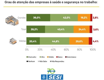No levantamento, realizado entre outubro de 2015 e fevereiro de 2016, 71,6% das indústrias afirmaram dar alta atenção à saúde e segurança dos trabalhadores. Além disso, na visão de 76,4% dos entrevistados, o grau de atenção da indústria brasileira ao tema deve aumentar nos próximos cinco anos – para 13,2%, essa atenção deverá aumentar muito. A pesquisa mostra ainda que a alta importância dada ao tema está relacionada, sobretudo, à preocupação com o bem-estar do trabalhador, à maior conscientização das empresas e à prevenção de acidentes de trabalho.