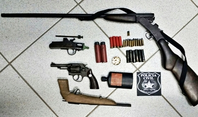 De acordo com informações, o suspeito foi detido com uma espingarda calibre 36, um revólver calibre 38 com numeração raspada, além de uma arma artesanal e munições.