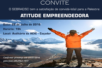 O SEBRAE de Caçador realiza dia 26 de julho, às 19 horas no auditório da ACIC palestra sobre Atitude Empreendedora com Neusa Balestrin Schumacher, da empresa Segmetre. O evento conta com apoio da ACIC e AMPE. A entrada é gratuita.