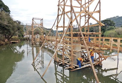 Nove pilares darão sustentação à ponte de 210 metros. Próxima etapa é colocação das travessas e depois as vigas pré-moldadas