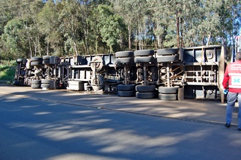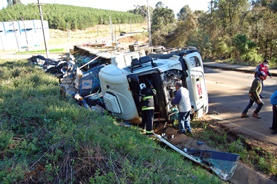 De acordo com informações, o motorista do veículo teria efetuado o contorno de uma curva em velocidade relativamente acima da máxima permitida e por este motivo a parte traseira pendeu e fez a carreta tombar.