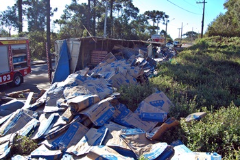 Uma carreta carregada de embalagens de papel tombou na tarde desta segunda-feira, 22 de agosto, na Rodovia Municipal Comendador Primo Tedesco, próximo ao Presídio Regional de Caçador. Ela havia saído da empresa Tedesco e seguia em direção a SC 350.