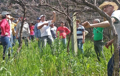 No encontro, os pesquisadores da Estação Experimental de Videira, André de Souza e Cristiane Wesp, além do técnico Roberto Bolzani, mostraram aos agricultores presentes algumas técnicas com relação à poda de videira, além do benefício da cobertura plástica protegendo as parreiras.