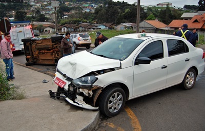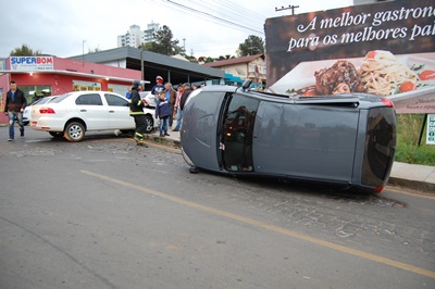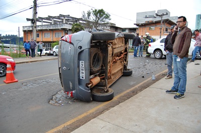 Com a força da colisão, a condutora do Sandero perdeu o controle da direção e o veículo acabou tombando na lateral da via. Vilma da Luz, de 30 anos, ficou ferida e foi socorrida pelos Bombeiros Voluntários.