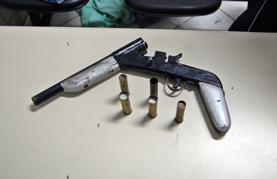 Em buscas numa sacola a qual lhe pertencia, os PM’s encontraram uma garrucha calibre .32 possivelmente de fabricação caseira e cinco cartuchos.