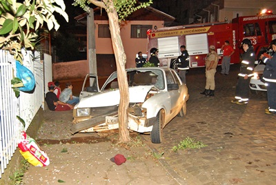 Um GM Chevette com placas de Caçador bateu numa árvore na madrugada deste domingo, 15 de janeiro, na Rua Tio Balduino, no Centro do município. O condutor fugiu de uma barreira policial que ocorria na Rua Herculano Coelho de Souza. Com ele estavam outras quatro pessoa.