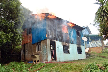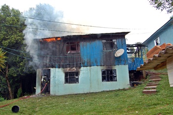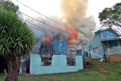 Uma casa mista de dois pavimentos foi destruída por um incêndio na manhã desta quinta-feira, 9 de fevereiro, na Rua Luiz Tortato, no Bairro Nossa Senhora Salete, em Caçador. A intensidade do fogo ameaçou também outras residências próximas, mas os combatentes do Corpo de Bombeiros Voluntários agiram rapidamente e evitaram maiores danos.