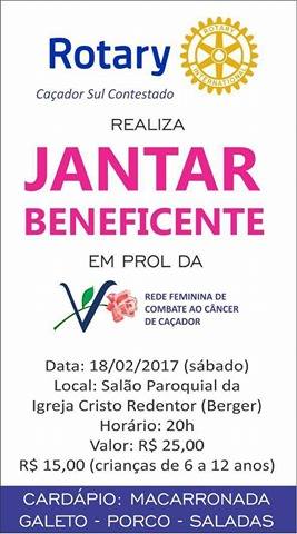 O Rotary Caçador Sul Contestado promove no sábado dia 18 de fevereiro, um Jantar Beneficente em prol da Rede Feminina de Combate ao Câncer de Caçador.