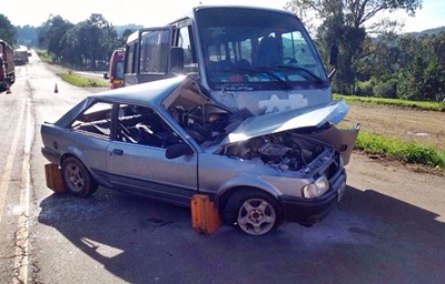 Um grave acidente de trânsito no início da manhã desta segunda-feira, 20 de fevereiro, no KM 30 da Rodovia SC-350, próximo a acesso ao município de Macieira tirou a vida de uma pessoa e deixou outra ferida. A colisão envolveu um Ford Escort e um micro ônibus, ambos de Caçador.
