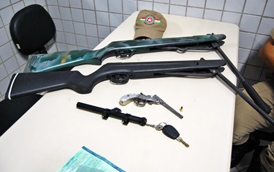 No interior do carro, os policiais encontraram apenas uma garrucha calibre .22, porém no sítio onde os dois estavam, foram localizadas duas espingardas, uma de pressão e outra calibre .22 modificada.